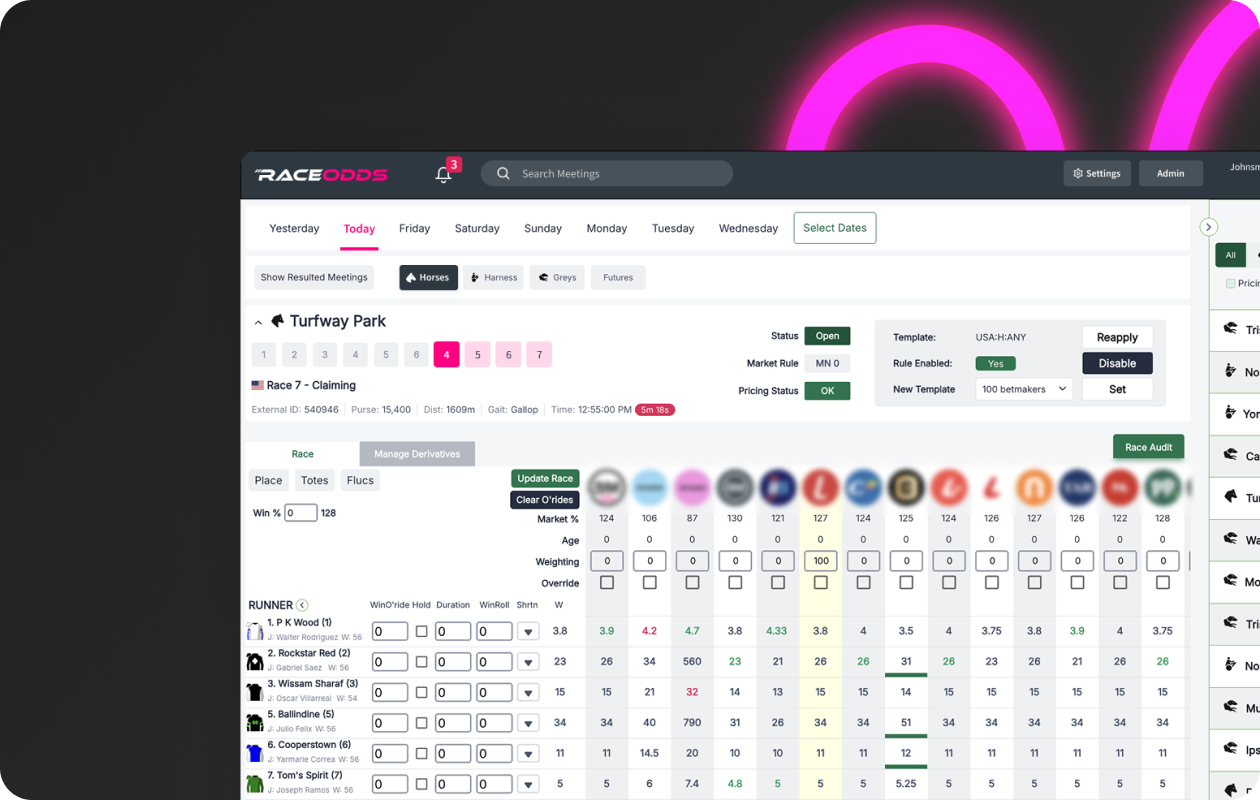 BetMakers' Fixed Odds stack gives you complete control, speed, and scale. Whether you're building from the ground up or need a plug-and-play solution, our modular platform adapts to your strategy. At its core is RaceOdds, powering market creation, pricing, and coverage across all three racing codes, with flexible services layered on to meet your needs.